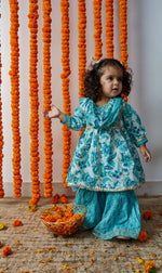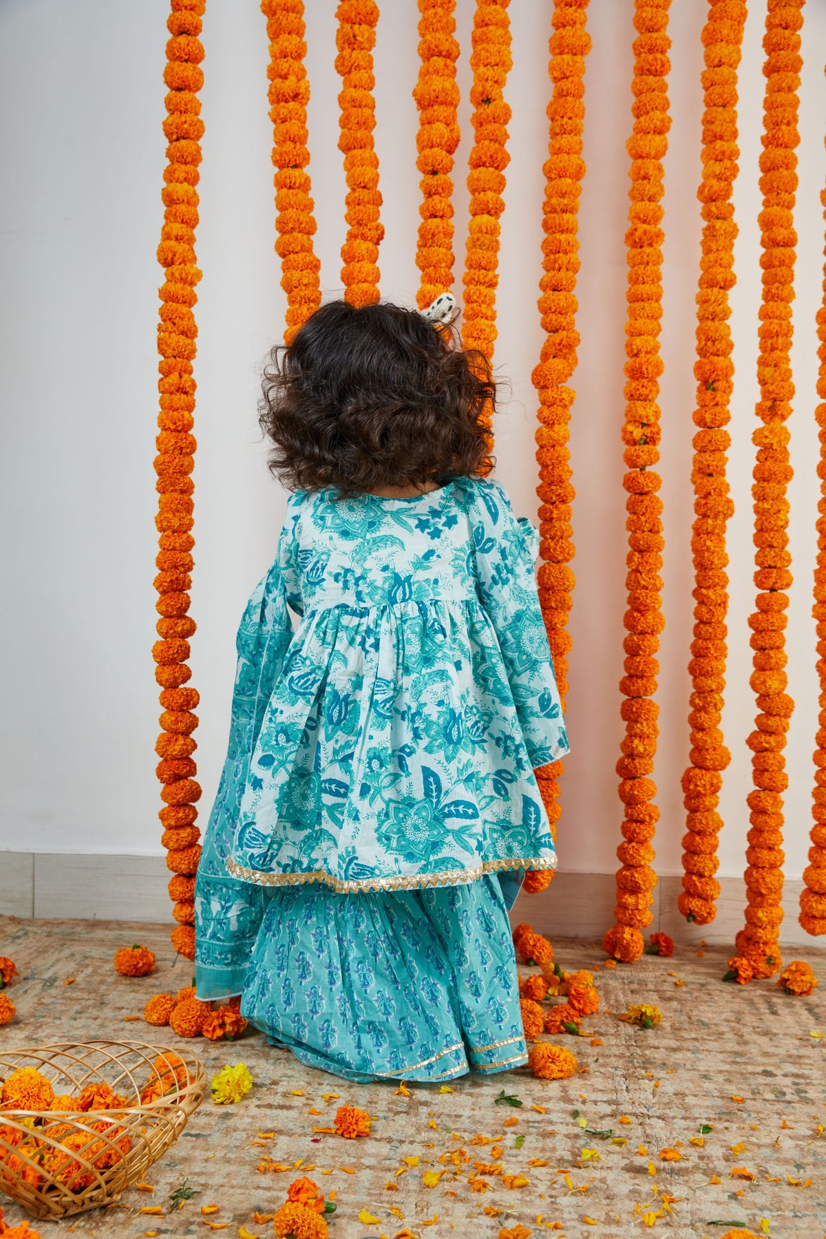 Introducing our Blue and White Floral Jaal Hand Block Printed Sharara Suit Set for girls. With Gota Details, this ethnic wear is the cutest summer edition for all sanskaari looks. Crafted from premium cotton fabric with ethnic prints and AZO-free natural dyes, it offers comfort and style. Our artisans meticulously handcraft each piece, ensuring exceptional craftsmanship. Perfect for special occasions and festivals, making your little one stand out in this eco-friendly attire. Order now to add a touch of tradition and style to their wardrobe.
