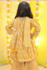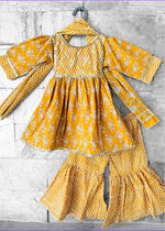 Introducing our GoldenRod Floral Booti Hand Block Printed Kurta Sharara Set for girls. Crafted from premium cotton fabric with ethnic prints and AZO-free natural dyes, it offers comfort and style. Our artisans meticulously handcraft each piece, ensuring exceptional craftsmanship. Perfect for special occasions and festivals, making your little one stand out in this eco-friendly attire. Order now to add a touch of tradition and style to their wardrobe.