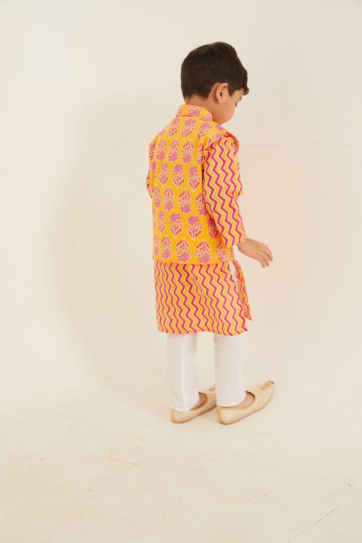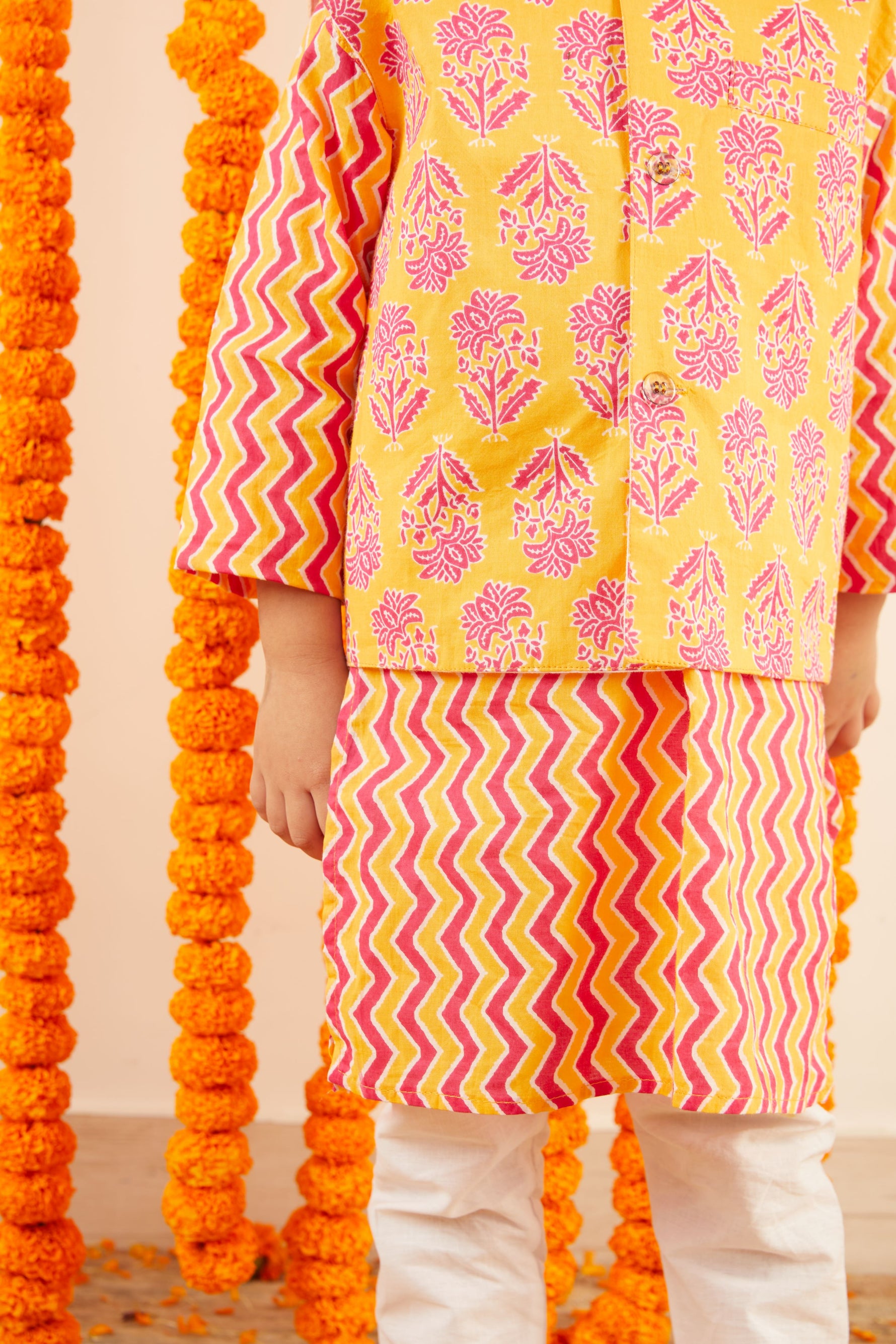 We are introducing our Dahlia Print Jacket with Zig Zag Kurta & Pajama for boys. The Indian Festival inspired unique colour combination and vibrance will bring life to your kid's style and comfort. Crafted from premium cotton fabric with ethnic prints and AZO-free natural dyes, it offers comfort and style. Our artisans meticulously handcraft each piece, ensuring exceptional craftsmanship. Perfect for special occasions and festivals, making your little one stand out in this eco-friendly attire. Order now to add a touch of tradition and style to their wardrobe.