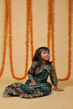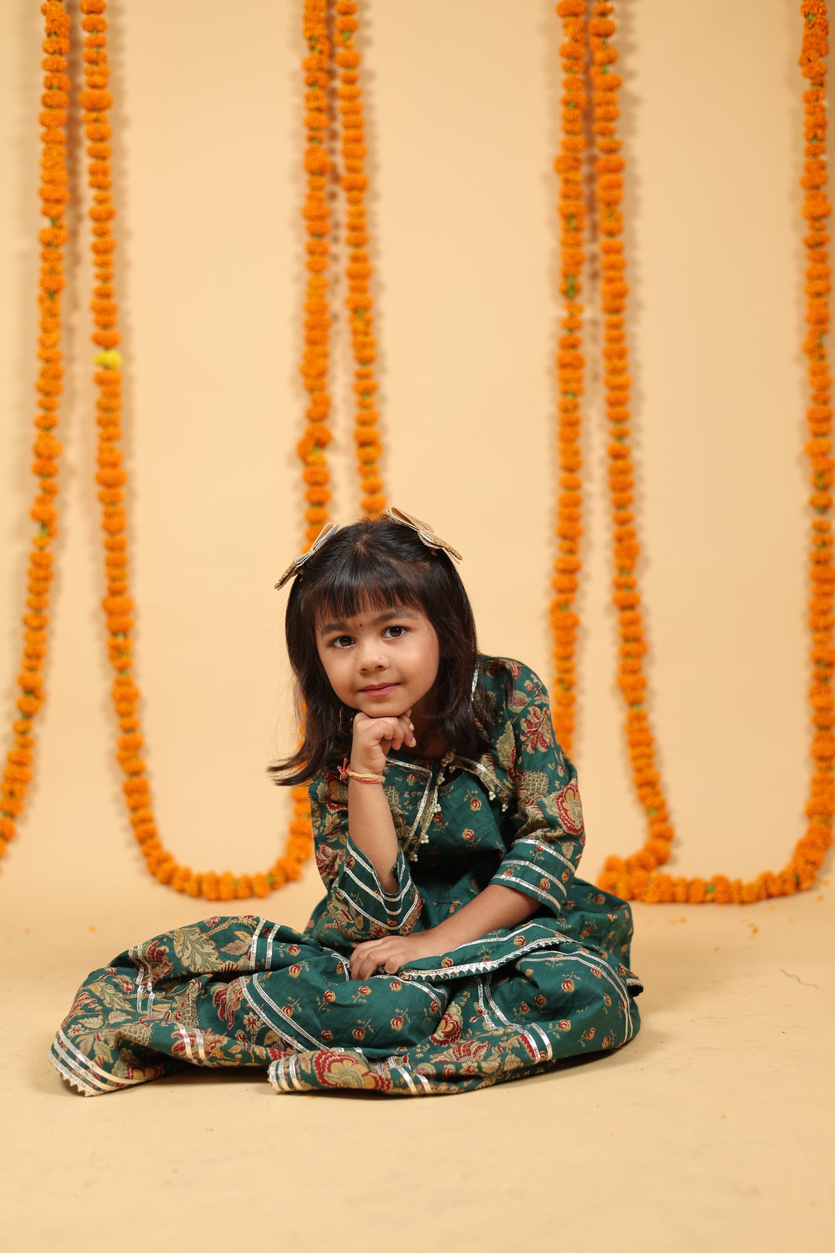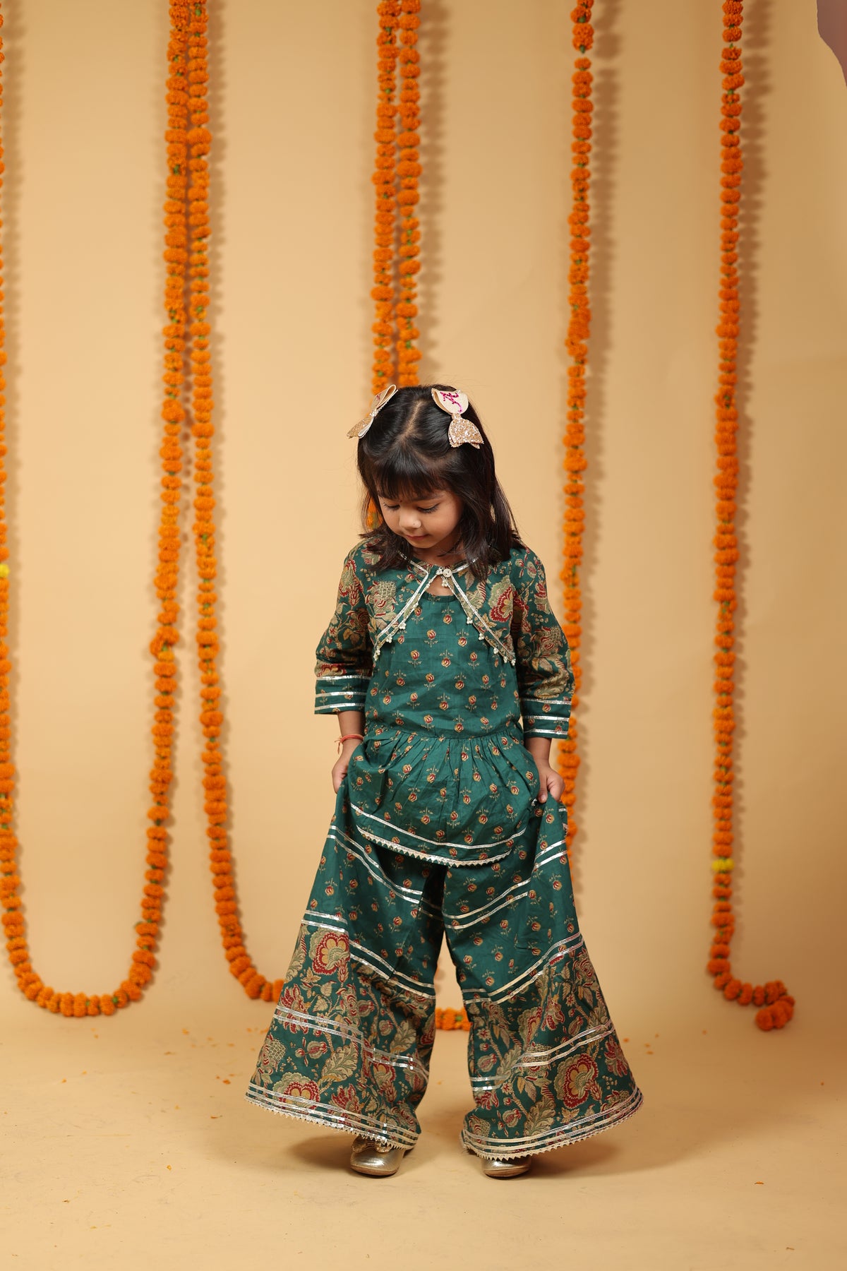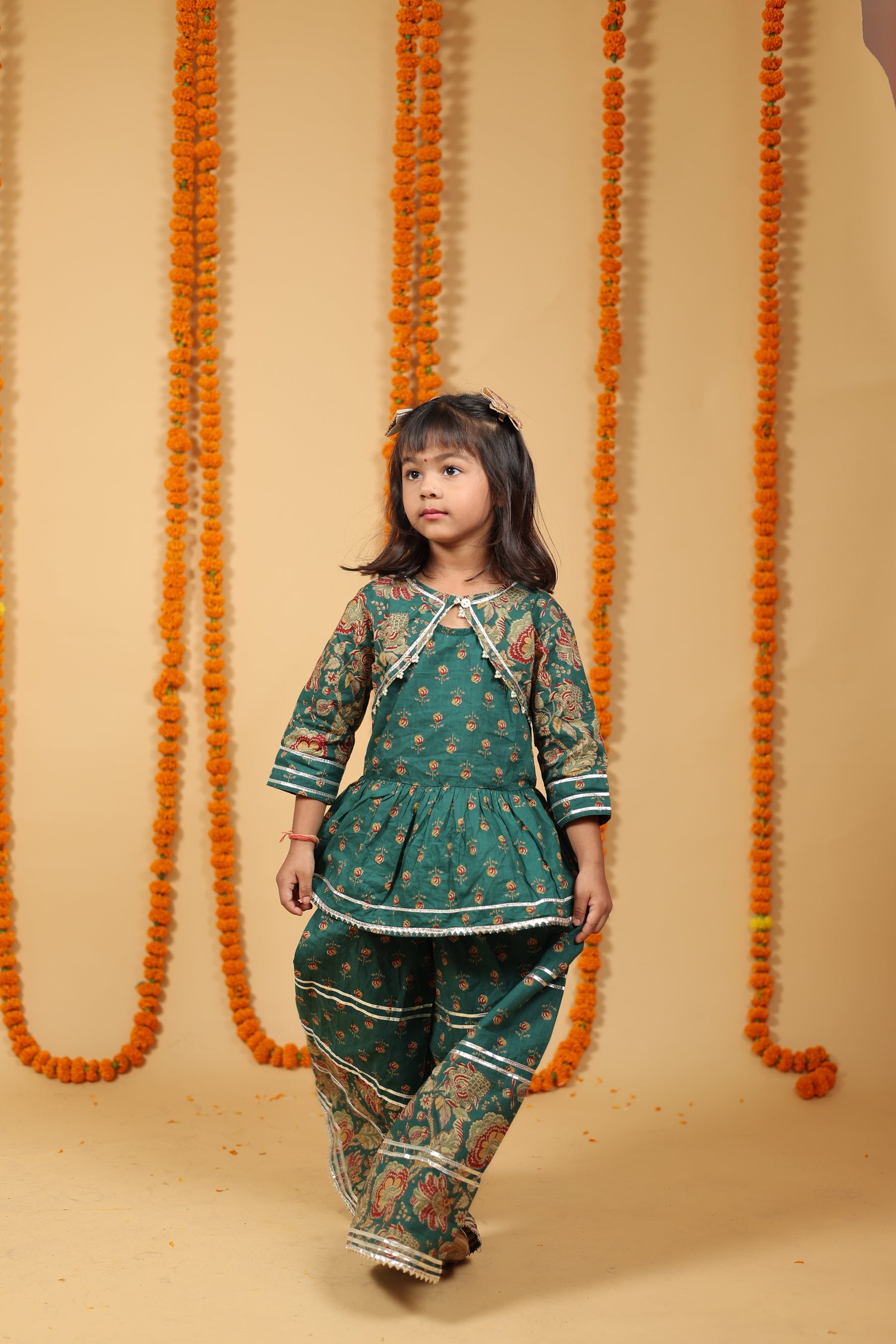 Let your little one shine in our Emerald Green Kurta Plazo Set, featuring a stylish koti-style cut that adds a unique flair. With its graceful flare and intricate details, this outfit is designed to make her stand out effortlessly. Crafted from premium cotton fabric and adorned with ethnic prints, it’s dyed with AZO-free, natural dyes for a comfortable, eco-friendly wear.