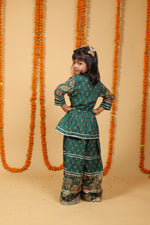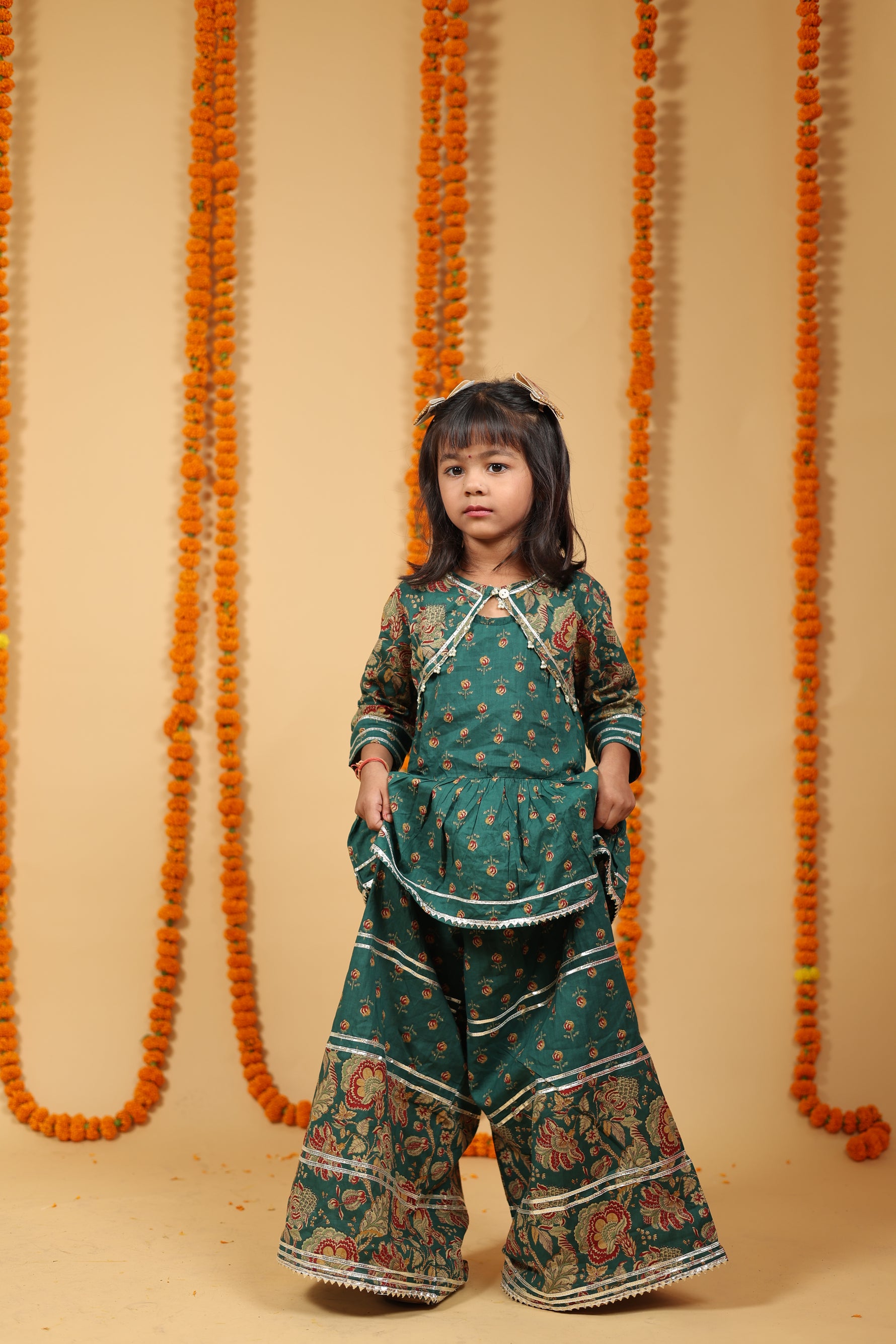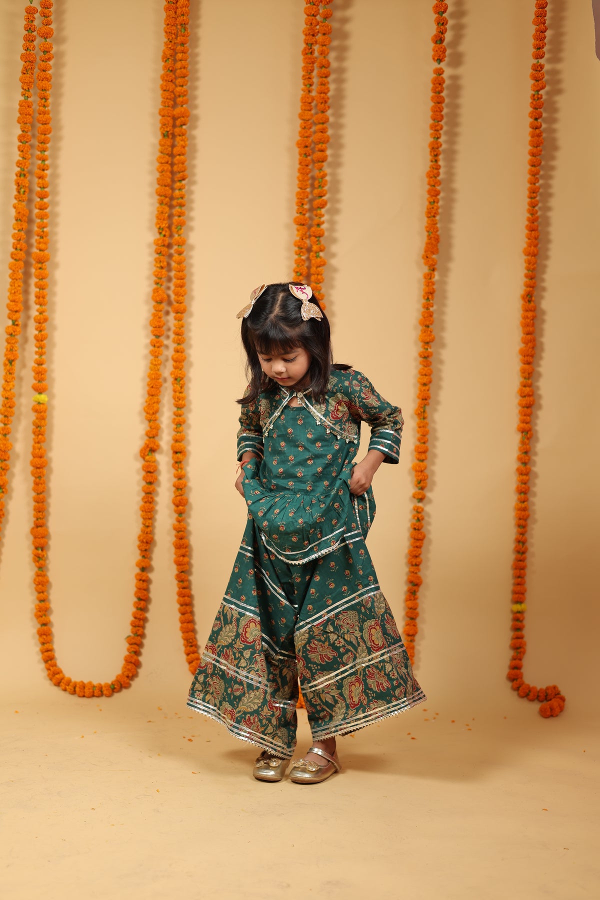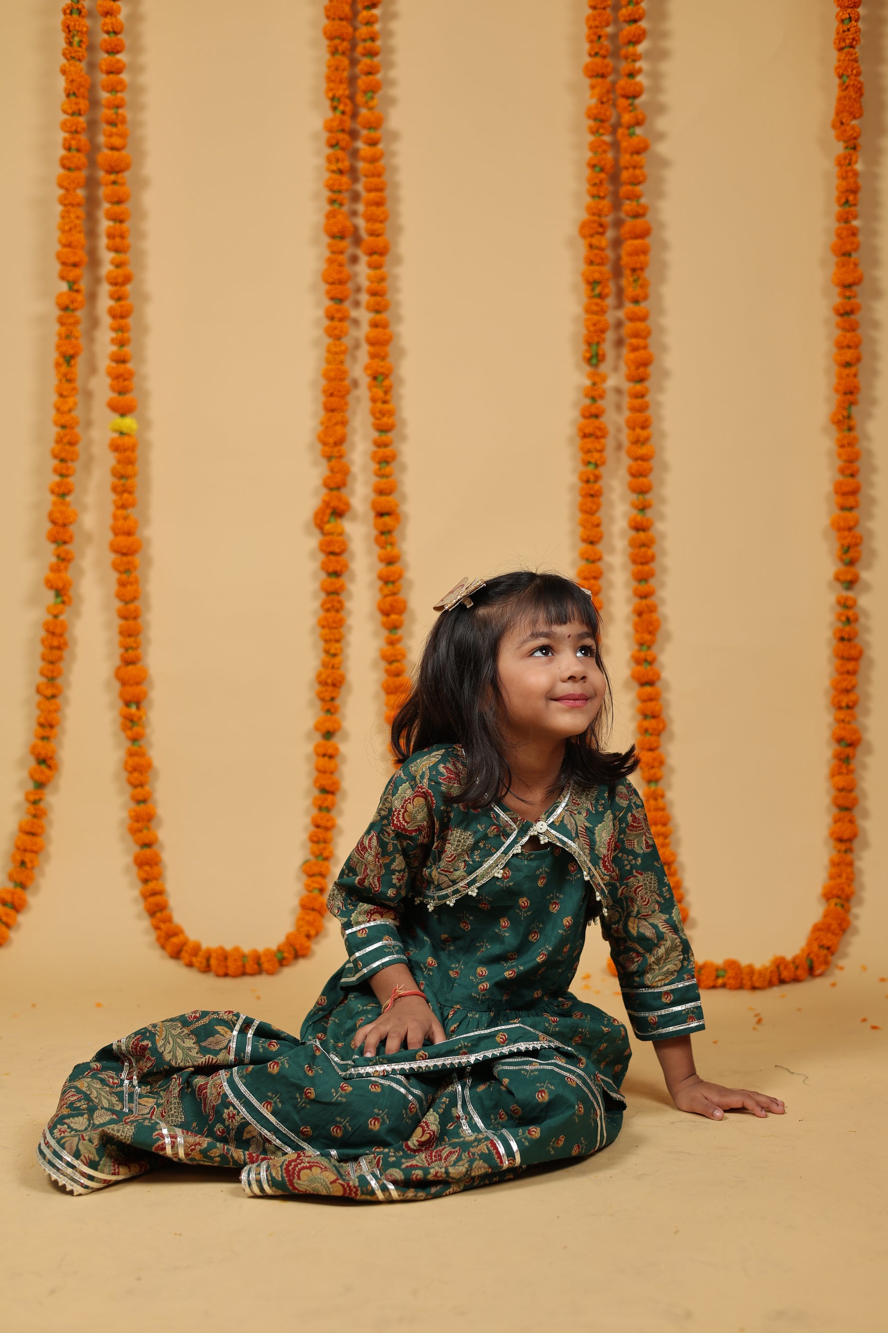 Let your little one shine in our Emerald Green Kurta Plazo Set, featuring a stylish koti-style cut that adds a unique flair. With its graceful flare and intricate details, this outfit is designed to make her stand out effortlessly. Crafted from premium cotton fabric and adorned with ethnic prints, it’s dyed with AZO-free, natural dyes for a comfortable, eco-friendly wear.