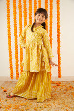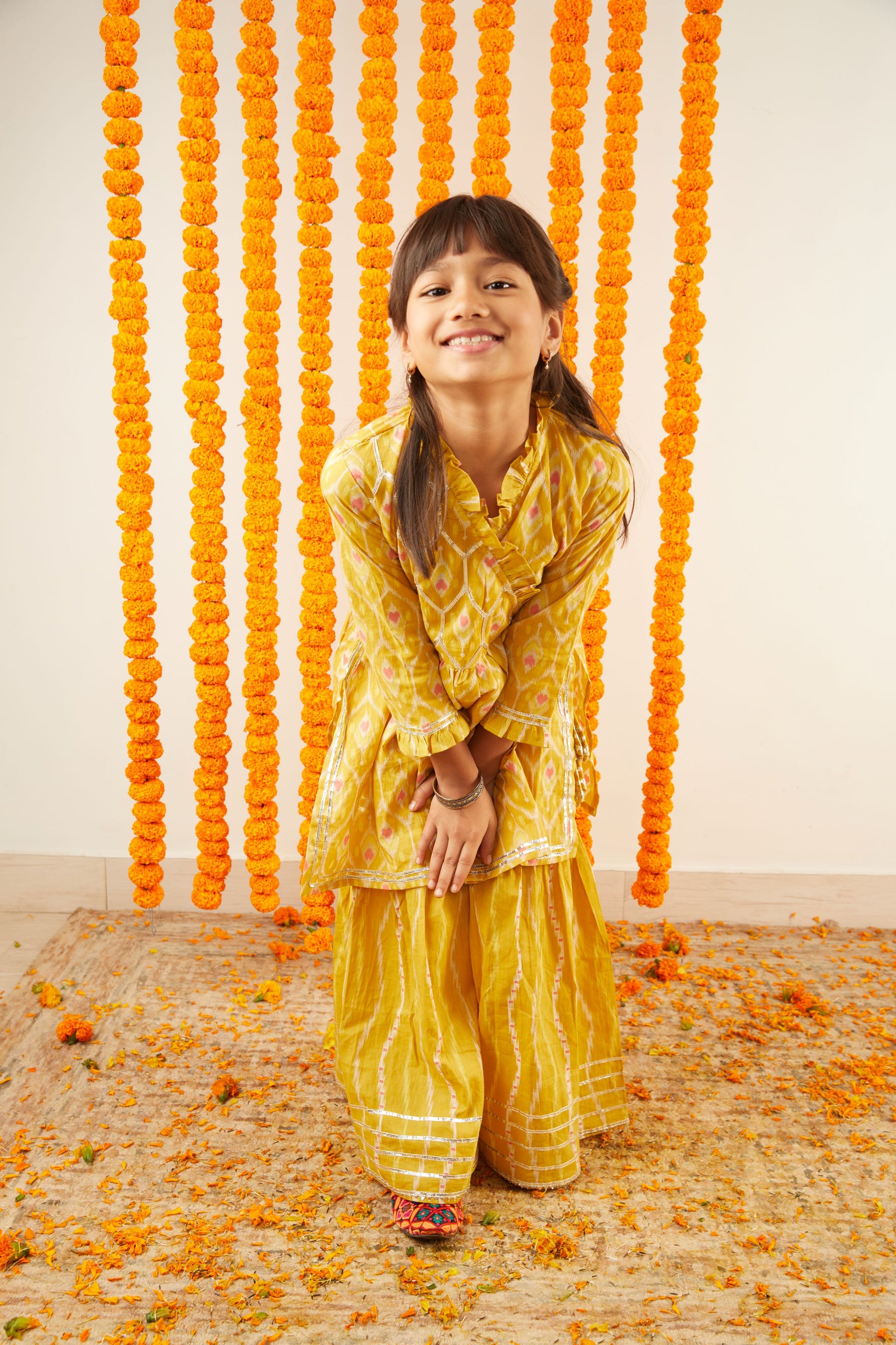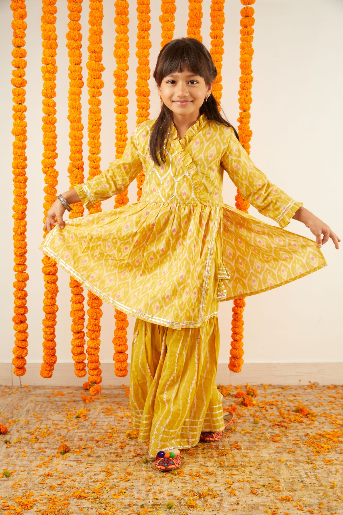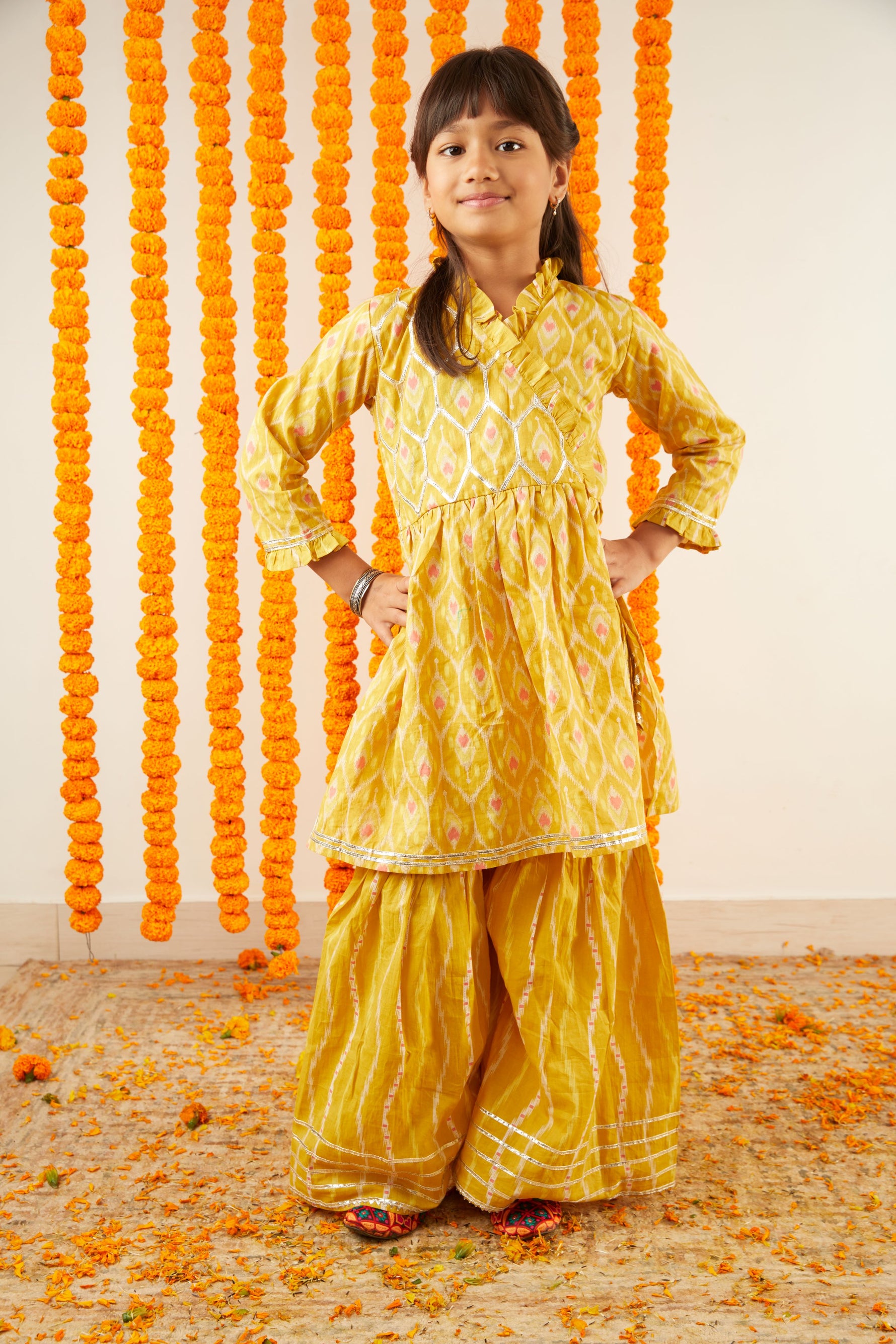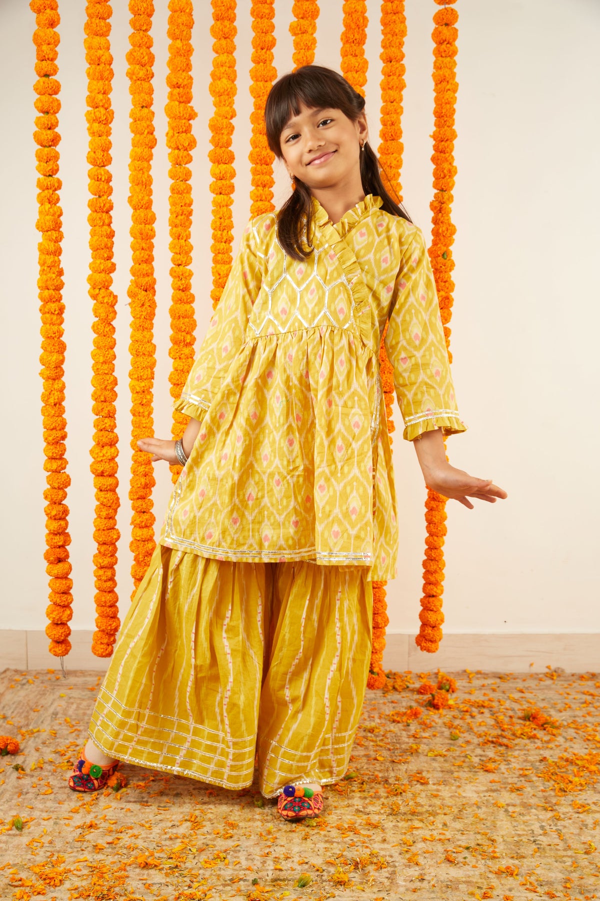 We are introducing our Ikkat Inspired Print Angrakha Style Kurta Sharara Set for Girls. The set comes without a dupatta and has gota details, maximising the look with unbeatable comfort. Crafted from premium cotton fabric with ethnic prints and AZO-free natural dyes, it offers comfort and style. Our artisans meticulously handcraft each piece, ensuring exceptional craftsmanship. Perfect for special occasions and festivals, making your little one stand out in this eco-friendly attire. Order now to add a touch of tradition and style to their wardrobe.