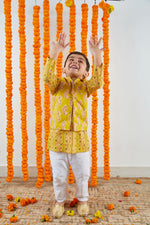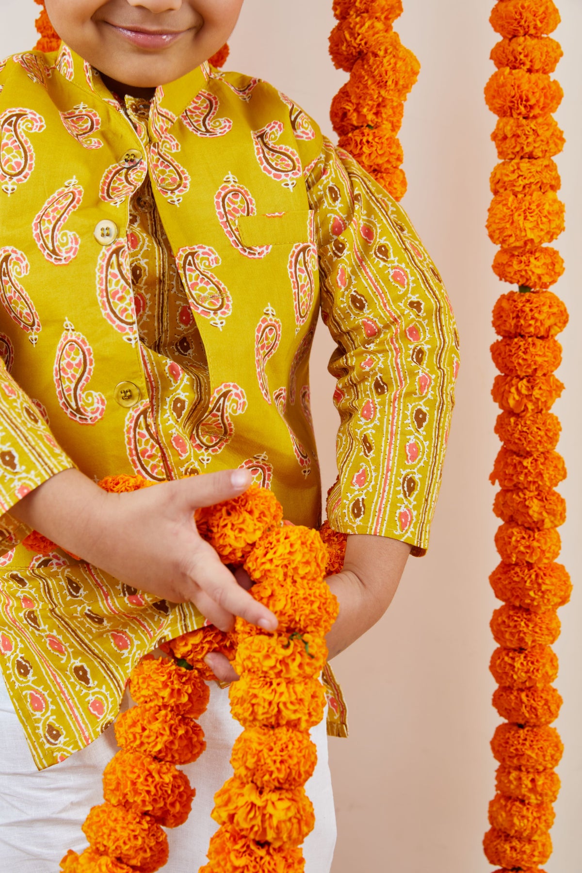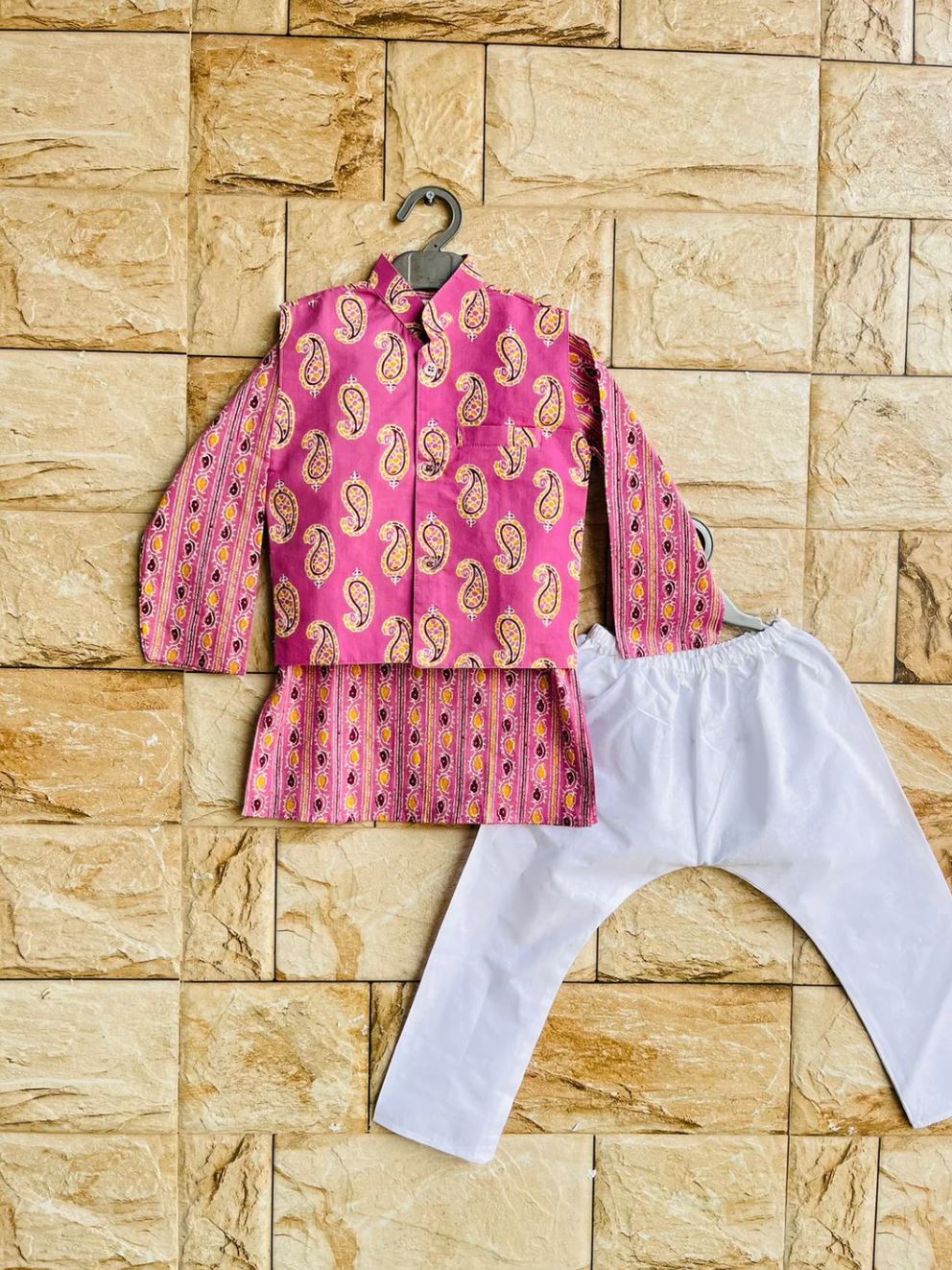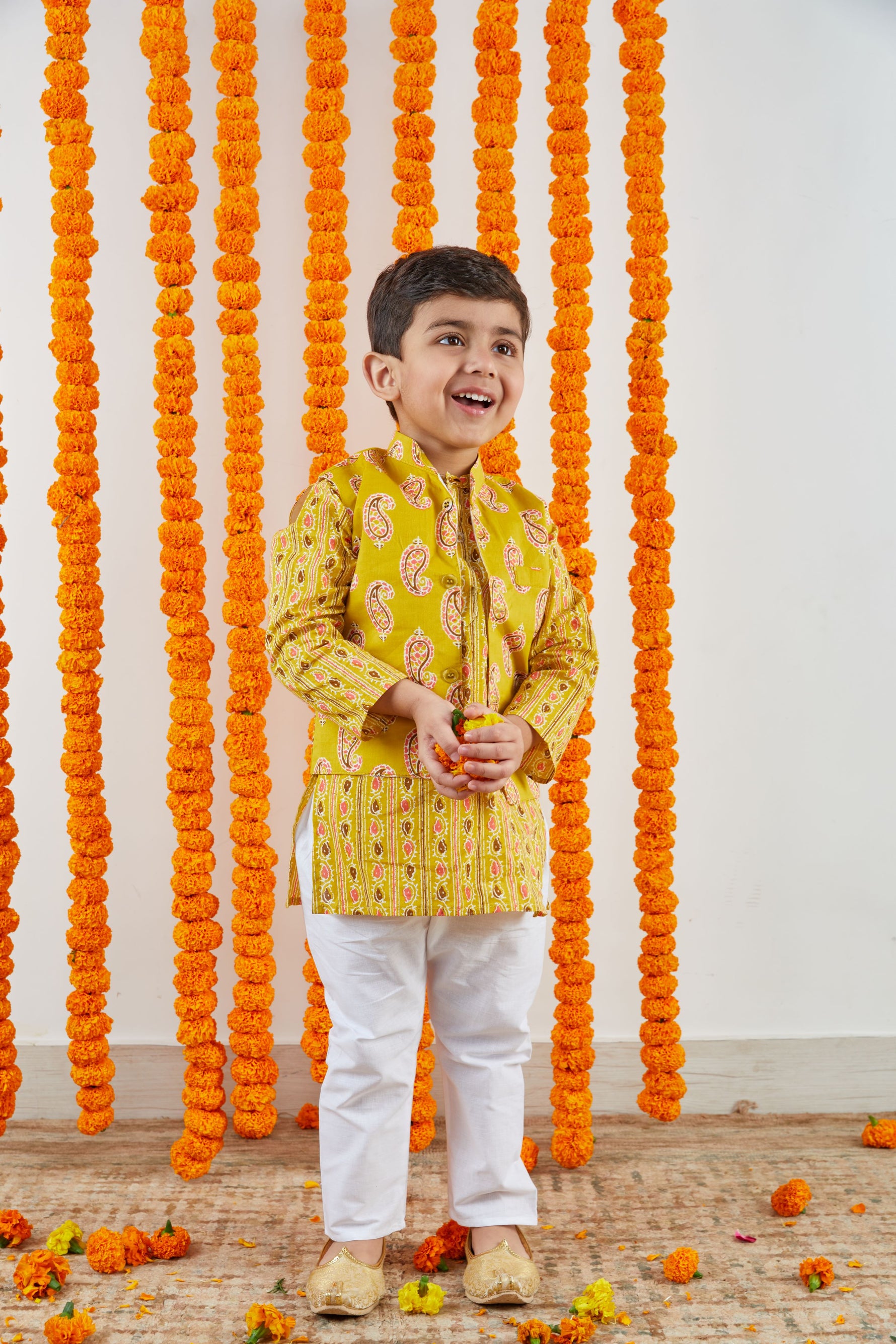 We are introducing our Kairi Print Jacket with Coordinating Kurta & Pajama for boys. The Indian Festival inspired unique colour combination and vibrance will bring life to your kid's style and comfort. Crafted from premium cotton fabric with ethnic prints and AZO-free natural dyes, it offers comfort and style. Our artisans meticulously handcraft each piece, ensuring exceptional craftsmanship. Perfect for special occasions and festivals, making your little one stand out in this eco-friendly attire. Order now to add a touch of tradition and style to their wardrobe.