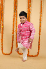 Elevate your little one’s festive wardrobe with our Pink Ikkat Inspired Print Jacket, paired with a classic kurta and pajama set. Crafted from premium cotton fabric, this outfit combines the beauty of traditional Ikkat-inspired prints with AZO-free, natural dyes for a skin-friendly, eco-conscious choice. The vibrant pink jacket adds a charming pop of color, while the classic kurta and pajama provide comfort and timeless style.