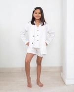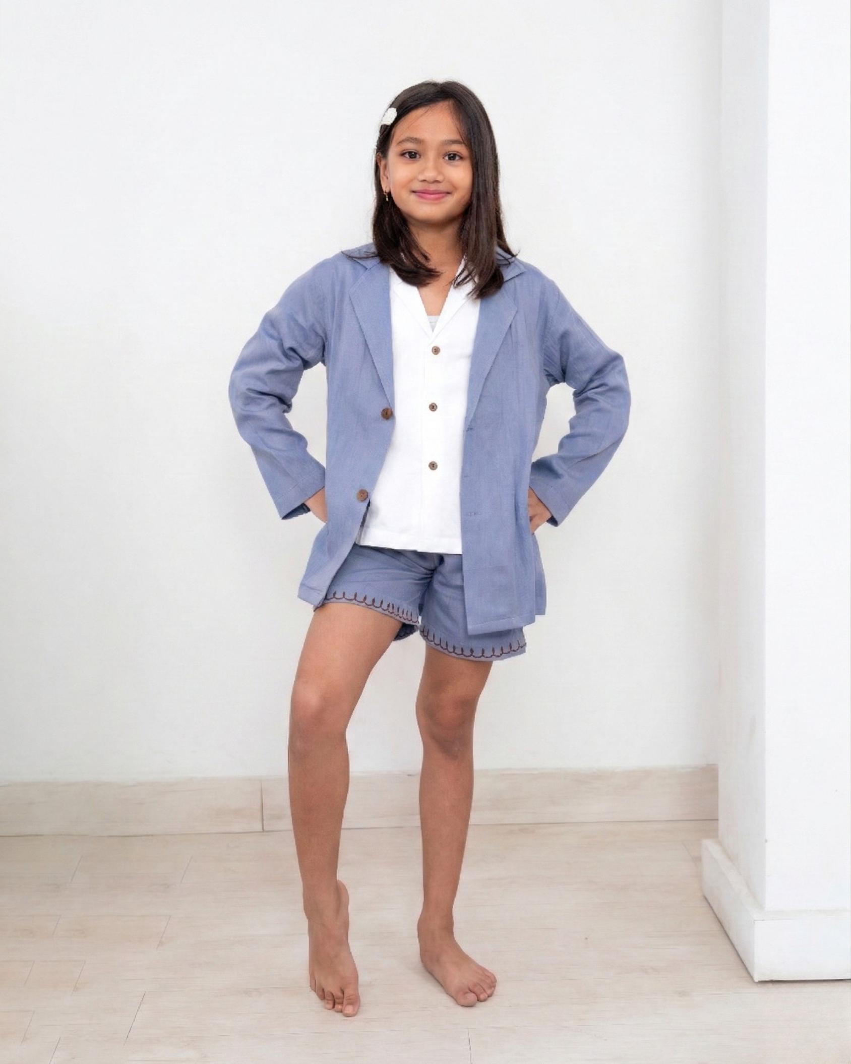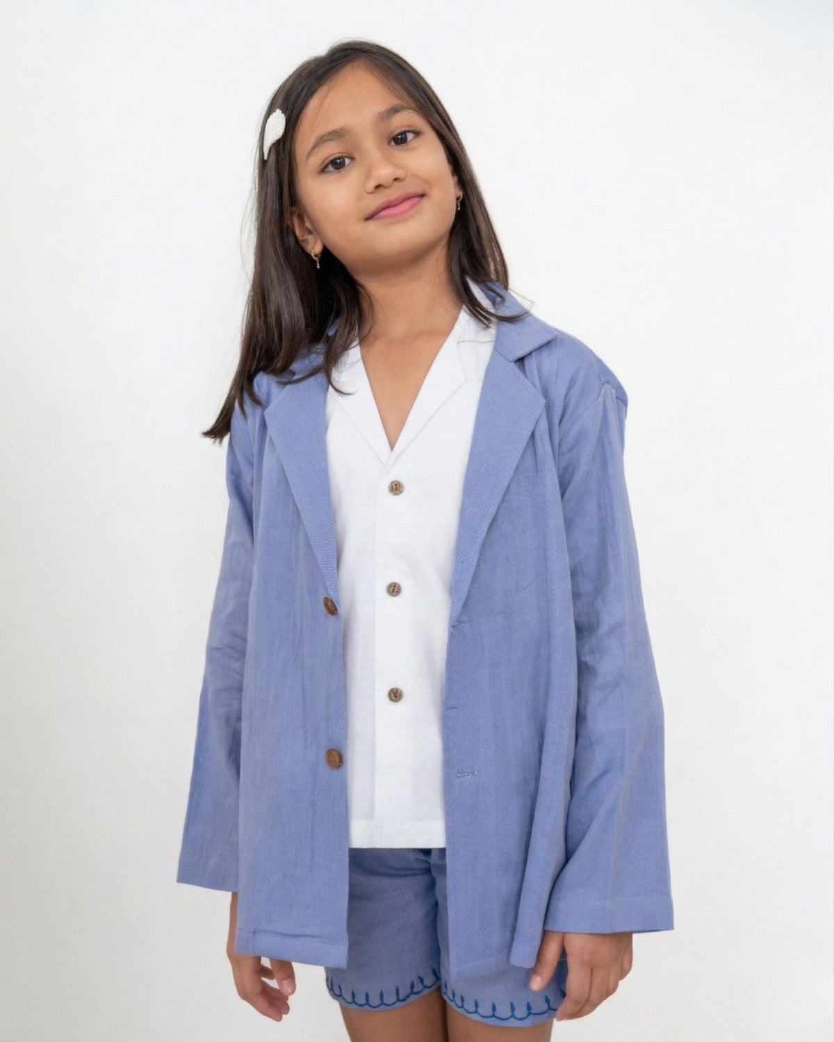 Made from soft Balarampuram handwoven cotton, the Urban Summer Blazer is created as a light layering piece suited for warm-weather dressing. Naturally breathable and gentle on the skin, the fabric keeps children comfortable while allowing easy movement through the day.