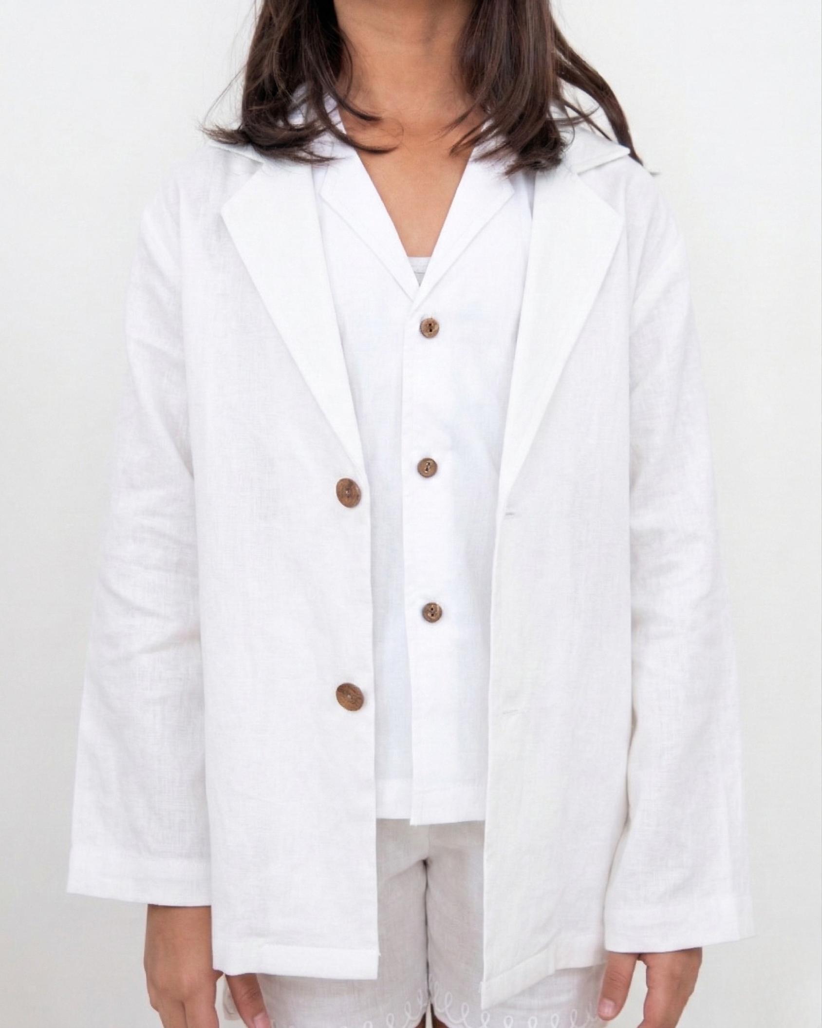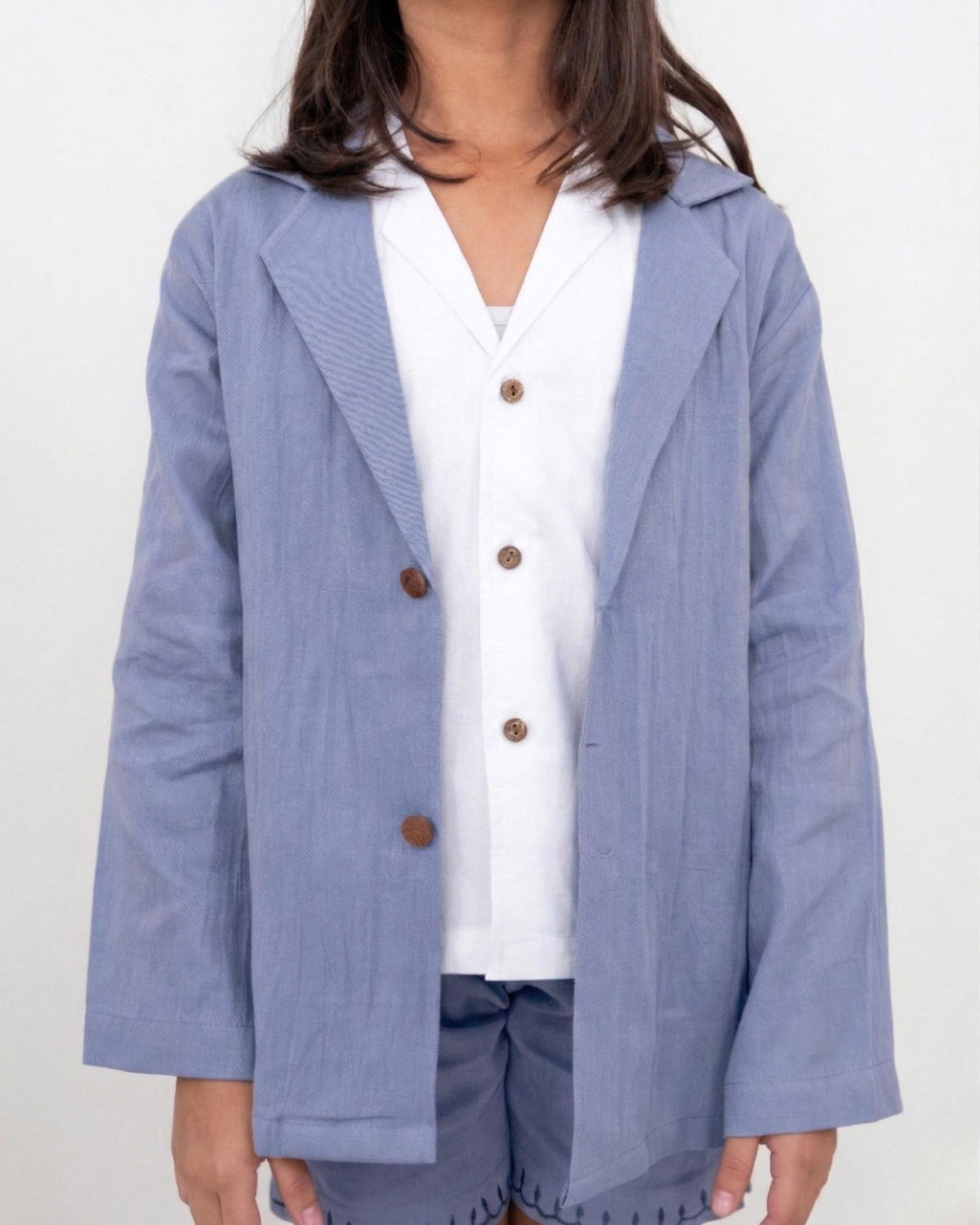 The design features a relaxed structure with a Cuban collar, full-length sleeves, and a straight silhouette that sits comfortably without restricting movement. Wooden button accents introduce a subtle handcrafted element, giving the blazer an understated yet refined character.