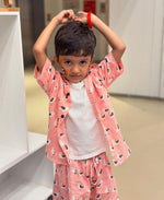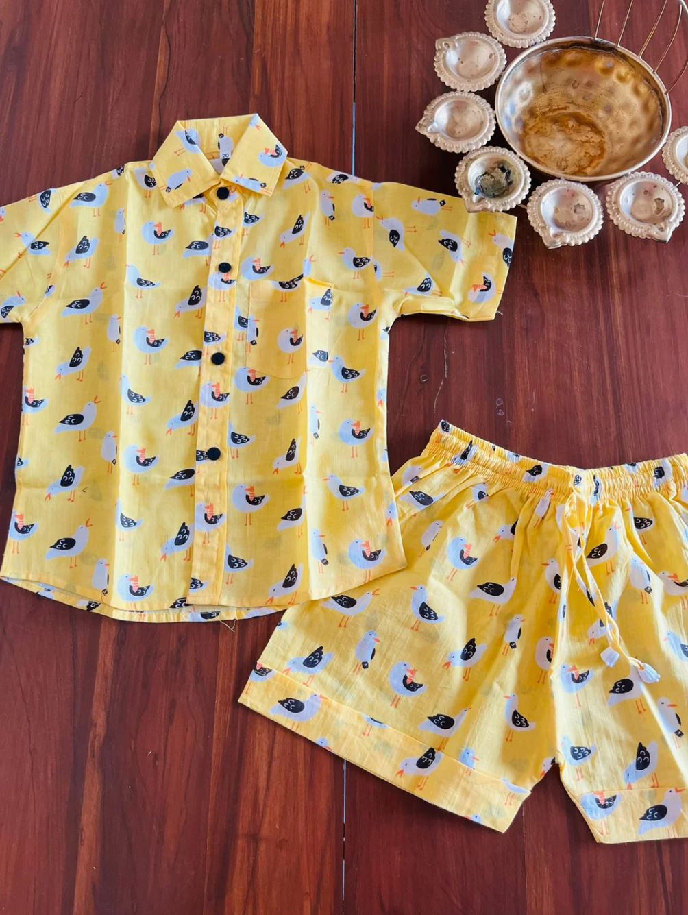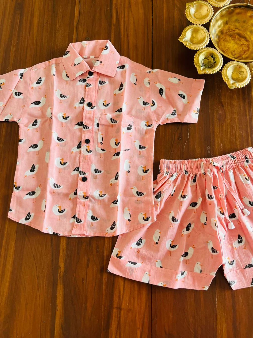 Brighten up your little one's wardrobe with our Feathered Friends Co-ord Set. This adorable set features a soft shirt and matching shorts, adorned with cheerful bird prints in shades of pink and yellow. Crafted from breathable cotton fabric, this outfit ensures all-day comfort, making it perfect for playdates, summer outings, or just lounging around.